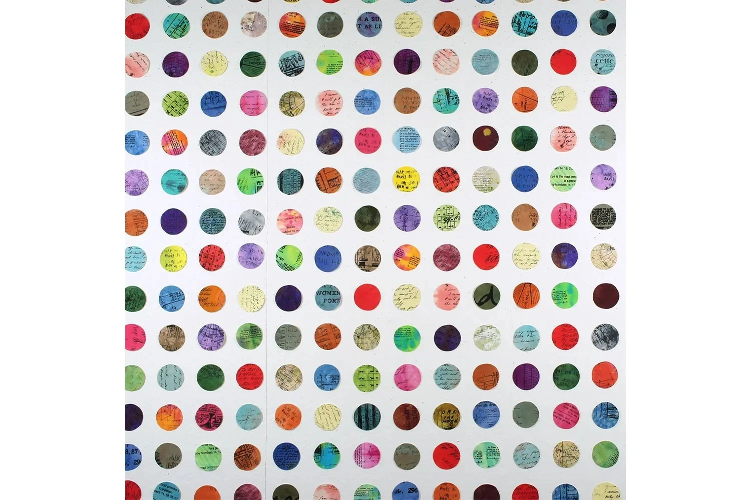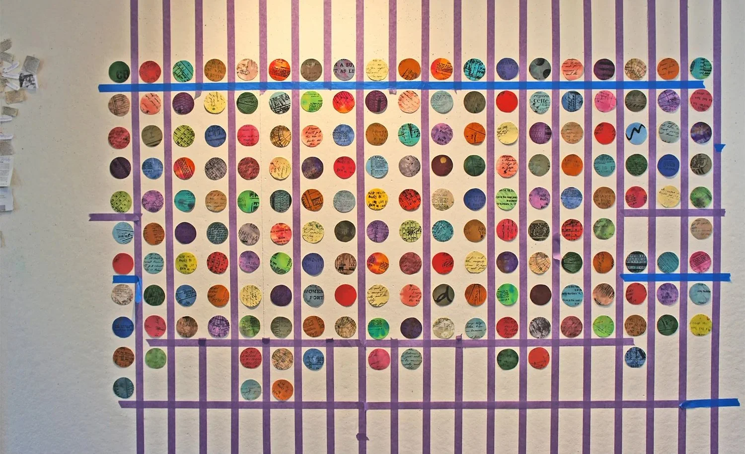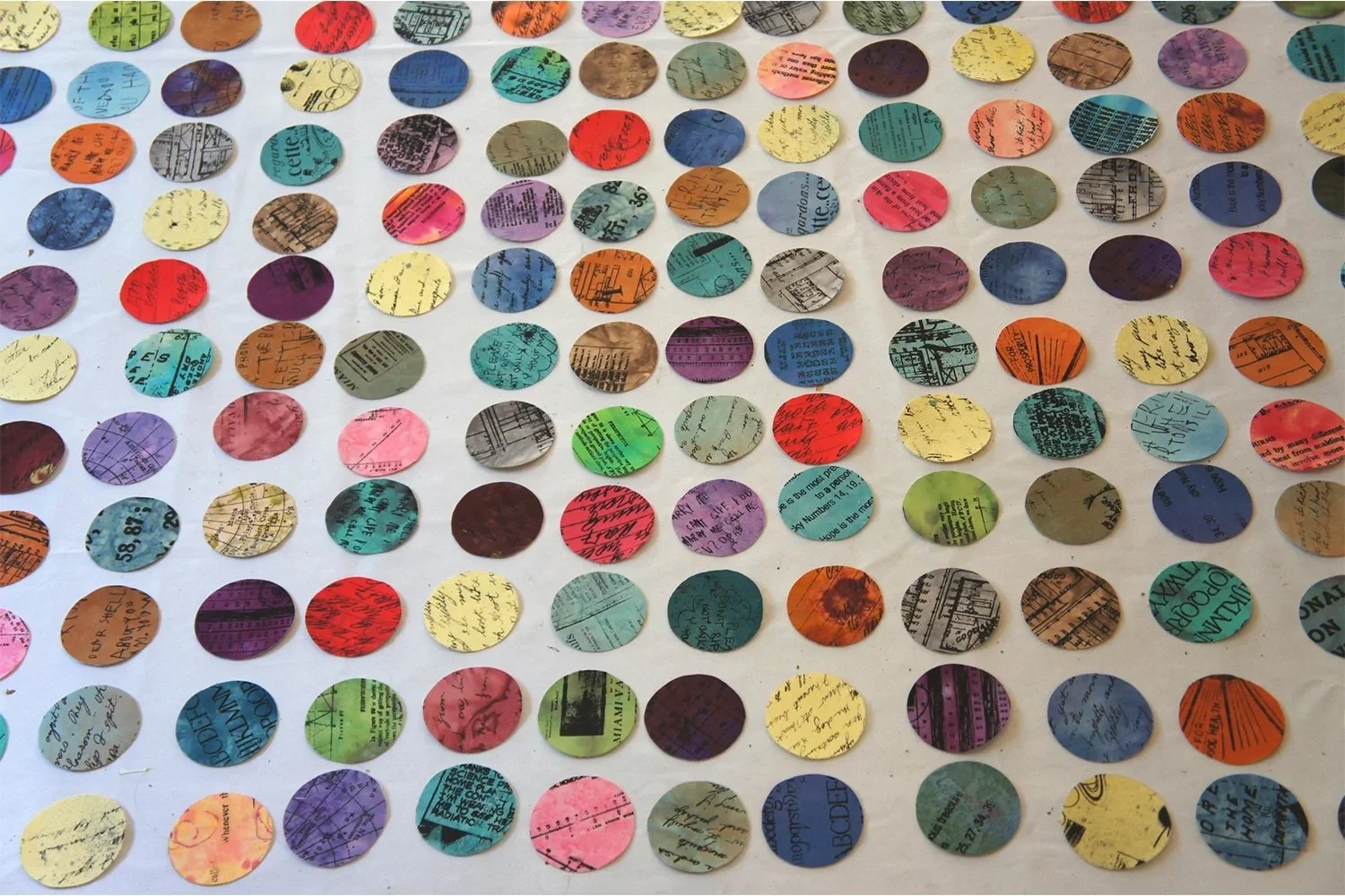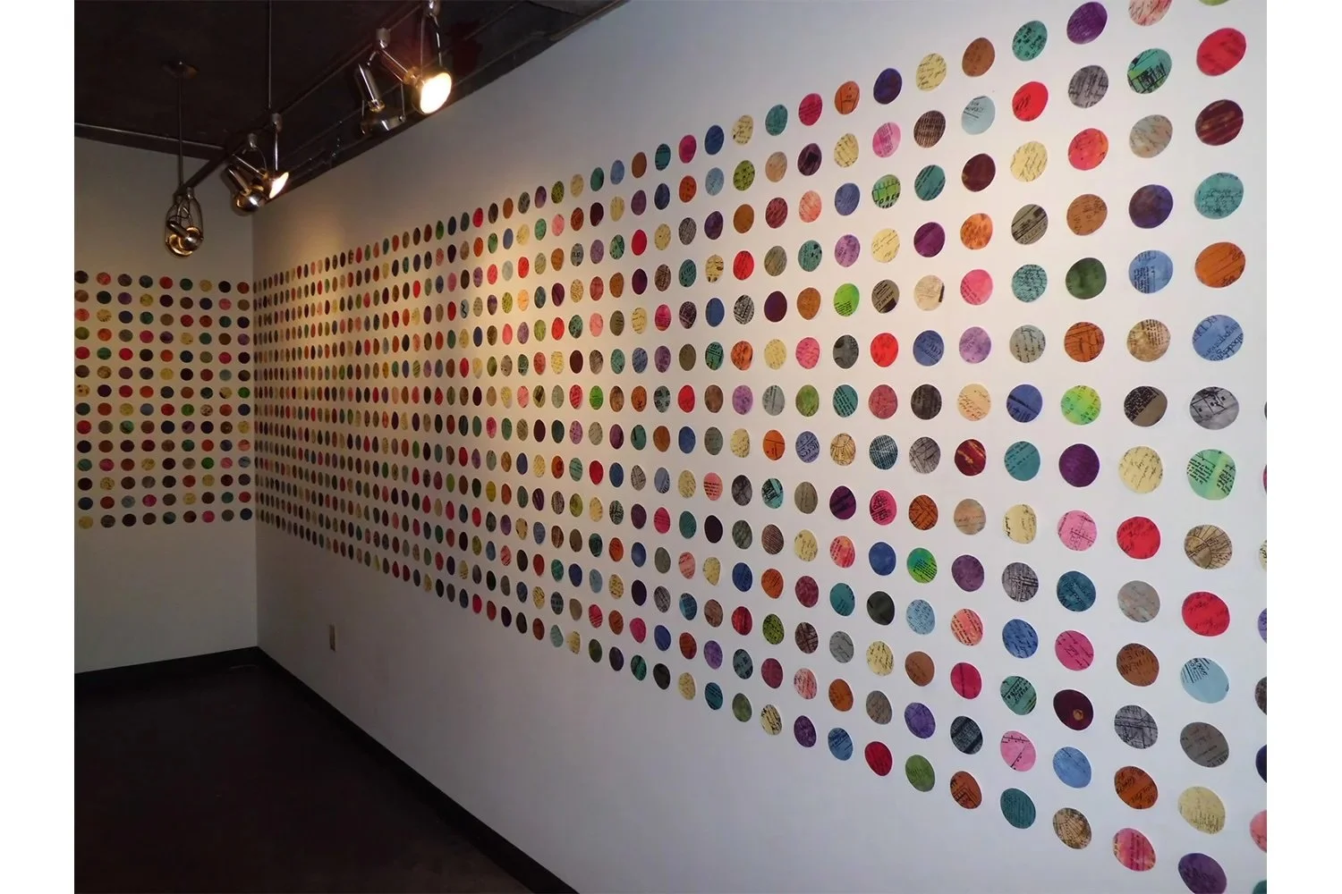 TEXTILED is an exercise in expanding space. The objective of the gallery was to present textiles that fit in a mailing tube. My intention was to dye and screen fabric to make as many circles that could fit into the tube (approximately 1460) which stretched the confines of 3 × 36 inches into 6 × 27 feet.